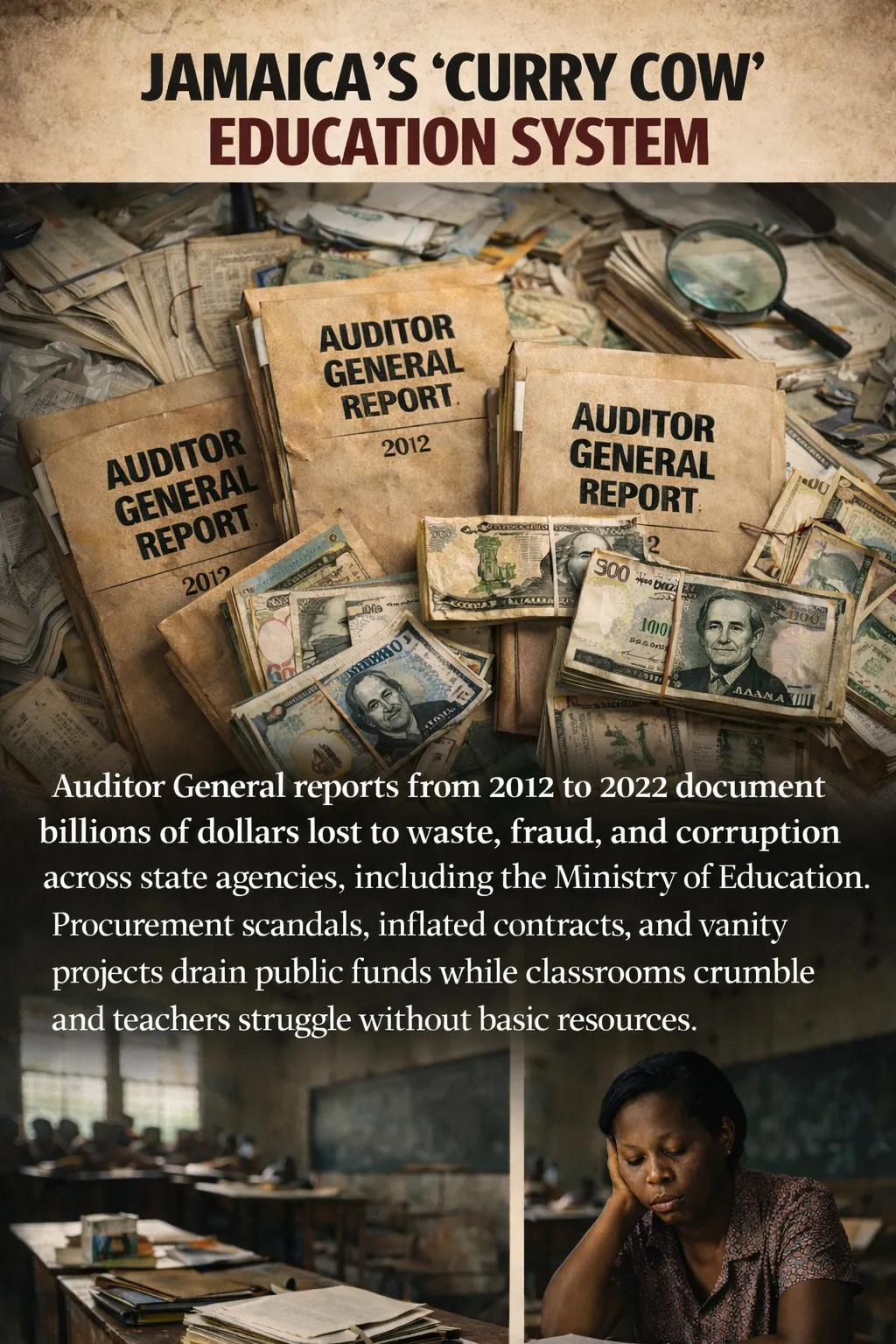 The problem is not scarcity; it is priority. Auditor General reports from 2012 to 2023 document billions of dollars lost to waste, fraud, and corruption across state agencies, including the Ministry of Education. Procurement scandals, inflated contracts, and vanity projects drain public funds while classrooms crumble and teachers struggle without basic resources.